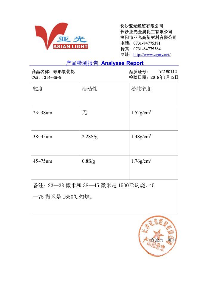 我公司根椐客戶要求最新研究出造粒5N氧化釔,粒徑20-100微米(可以根據用戶要求 篩分分級供應),主要用于電子噴涂(設備零件生產時電鍍用),質量保證,歡迎聯糸和試用選購。